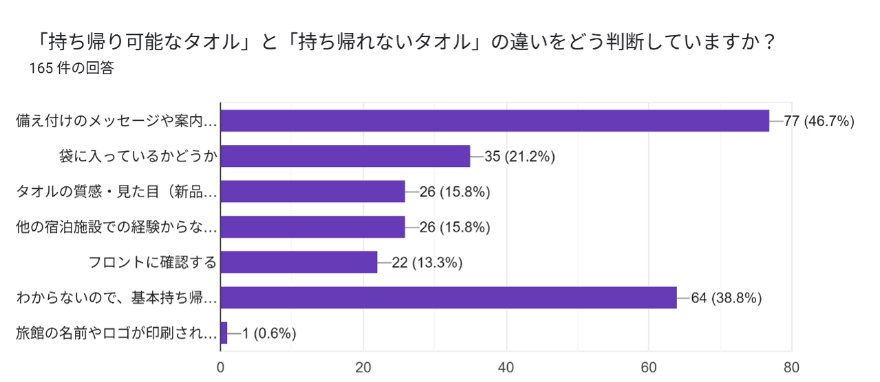 この結果から、タオルの持ち帰りを促進し、エコ活動を分かりやすく伝えるには、「持ち帰りOK」の明確な表示と個包装・新品感が決め手であることが分かりました。